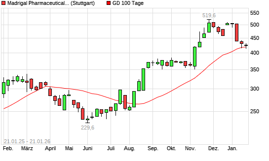 Mit dem Anstieg auf 429,10 EUR hat die Madrigal Pharmaceuticals-Aktie am 20.01.2026 die 100-Tage-Linie nach oben gekreuzt.