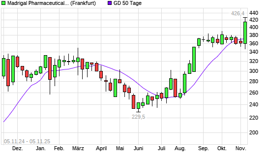 Mit dem Anstieg auf 385,70 EUR hat die Madrigal Pharmaceuticals-Aktie am 04.11.2025 die 50-Tage-Linie nach oben gekreuzt.