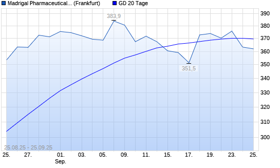 Mit dem Rücksetzer auf 363,30 EUR hat die Madrigal Pharmaceuticals-Aktie am 24.09.2025 die 20-Tage-Linie nach unten gekreuzt.