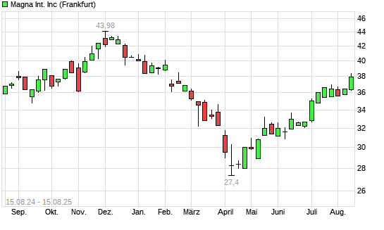 Mit dem Anstieg auf 38,32 EUR hat die Magna International-Aktie (ISIN CA5592224011) am 14.08.2025 ein neues 6-Monats-Hoch erreicht und damit den Kurs vom 13.08.2025 eingestellt.