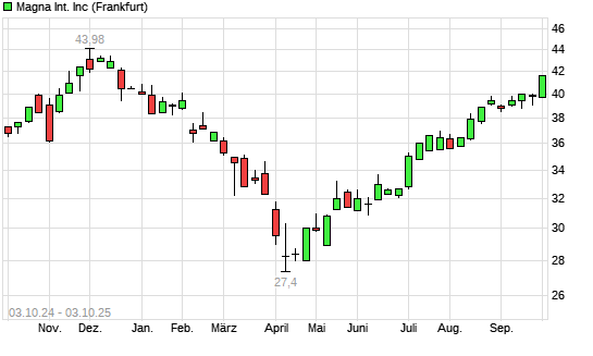 Mit dem Anstieg auf 40,29 EUR hat die Magna International-Aktie (ISIN CA5592224011) am 02.10.2025 ein neues 6-Monats-Hoch erreicht und damit den Kurs vom 30.09.2025 eingestellt.