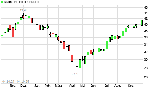 Mit dem Anstieg auf 41,64 EUR hat die Magna International-Aktie (ISIN CA5592224011) am 03.10.2025 ein neues 6-Monats-Hoch erreicht und damit den Kurs vom 02.10.2025 eingestellt.