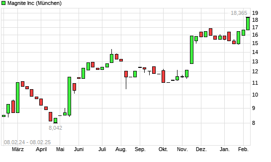 Mit dem Anstieg auf 19,76 EUR hat die Magnite (ex Rubicon Project)-Aktie (ISIN US55955D1000) am 07.02.2025 ein neues 3-Jahres-Hoch erreicht und damit den Kurs vom 06.02.2025 eingestellt.