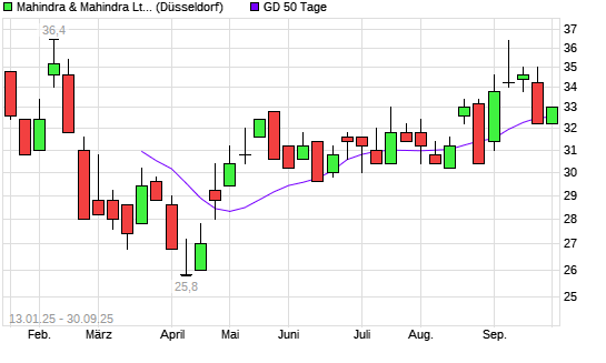 Mit dem Rücksetzer auf 32,60 EUR hat die Mahindra & Mahindra GDR-Aktie am 29.09.2025 die 50-Tage-Linie nach unten gekreuzt.