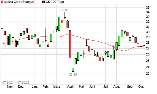Mit dem Anstieg auf 27,44 EUR hat die Makita Corp-Aktie am 06.10.2025 die 100-Tage-Linie nach oben gekreuzt.