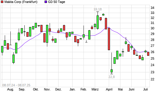 Mit dem Rücksetzer auf 26,00 EUR hat die Makita Corp-Aktie am 07.07.2025 die 50-Tage-Linie nach unten gekreuzt.