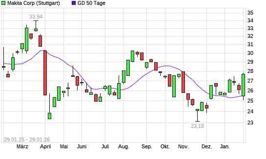 Mit dem Rücksetzer auf 25,20 EUR hat die Makita Corp-Aktie am 28.01.2026 die 50-Tage-Linie nach unten gekreuzt.