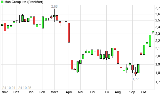 Mit dem Anstieg auf 2,34 EUR hat die Man Group-Aktie (ISIN JE00BJ1DLW90) am 23.10.2025 ein neues 6-Monats-Hoch erreicht und damit den Kurs vom 20.10.2025 eingestellt.