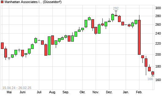 Mit dem Rücksetzer auf 168,00 EUR hat die Manhattan Associates-Aktie (ISIN US5627501092) am 25.02.2025 ein neues 12-Monats-Tief erreicht und damit den Kurs vom 11.02.2025 eingestellt.