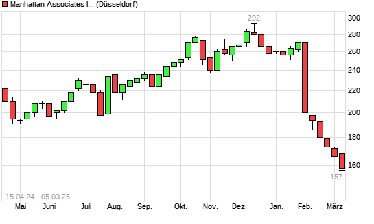 Mit dem Rücksetzer auf 164,00 EUR hat die Manhattan Associates-Aktie (ISIN US5627501092) am 04.03.2025 ein neues 12-Monats-Tief erreicht und damit den Kurs vom 25.02.2025 eingestellt.