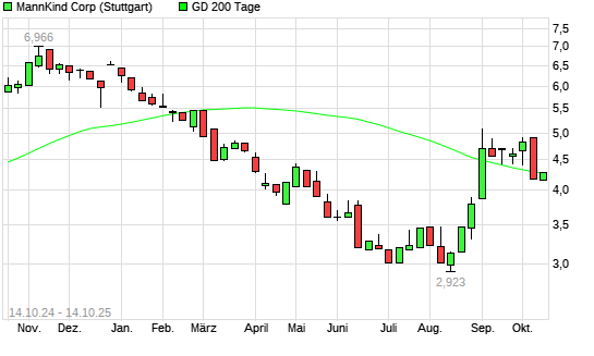 Mit dem Rücksetzer auf 4,15 EUR hat die MannKind-Aktie am 13.10.2025 die 200-Tage-Linie nach unten gekreuzt.
