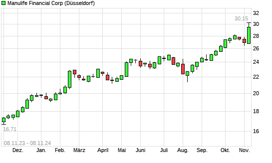 Mit dem Anstieg auf 28,74 EUR hat die Manulife Financial-Aktie (ISIN CA56501R1064) am 07.11.2024 ein neues 10-Jahres-Hoch erreicht und damit den Kurs vom 06.11.2024 eingestellt.