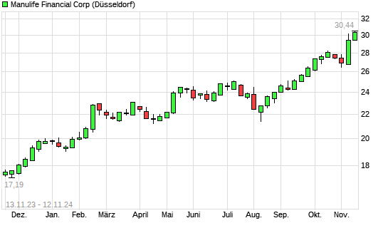 Mit dem Anstieg auf 30,15 EUR hat die Manulife Financial-Aktie (ISIN CA56501R1064) am 11.11.2024 ein neues 10-Jahres-Hoch erreicht und damit den Kurs vom 08.11.2024 eingestellt.