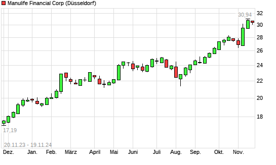 Mit dem Anstieg auf 30,90 EUR hat die Manulife Financial-Aktie (ISIN CA56501R1064) am 18.11.2024 ein neues 10-Jahres-Hoch erreicht und damit den Kurs vom 15.11.2024 eingestellt.