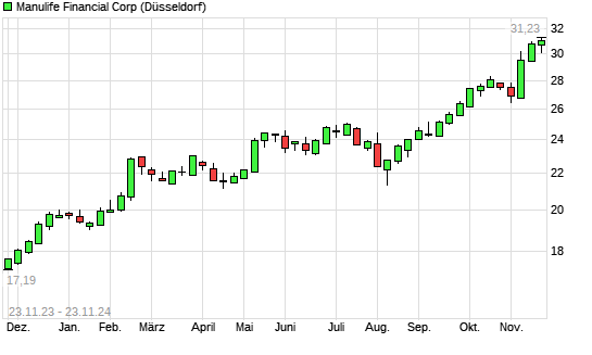 Mit dem Anstieg auf 30,99 EUR hat die Manulife Financial-Aktie (ISIN CA56501R1064) am 22.11.2024 ein neues 10-Jahres-Hoch erreicht und damit den Kurs vom 18.11.2024 eingestellt.