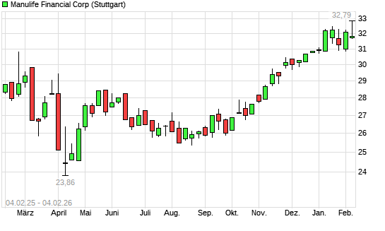Mit dem Anstieg auf 32,36 EUR hat die Manulife Financial-Aktie (ISIN CA56501R1064) am 03.02.2026 ein neues All-Time-High erreicht und damit den Kurs vom 16.01.2026 eingestellt.