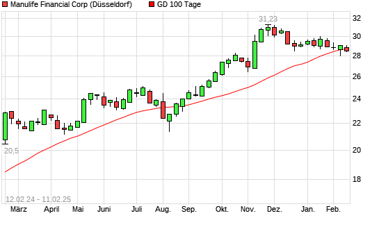 Mit dem Anstieg auf 28,79 EUR hat die Manulife Financial-Aktie am 10.02.2025 die 100-Tage-Linie nach oben gekreuzt.