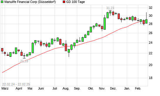 Mit dem Anstieg auf 29,80 EUR hat die Manulife Financial-Aktie am 21.02.2025 die 100-Tage-Linie nach oben gekreuzt.