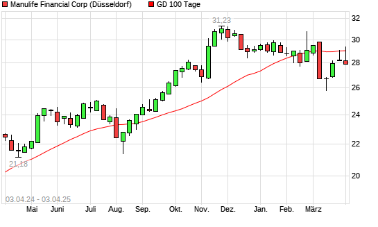 Mit dem Anstieg auf 28,98 EUR hat die Manulife Financial-Aktie am 02.04.2025 die 100-Tage-Linie nach oben gekreuzt.