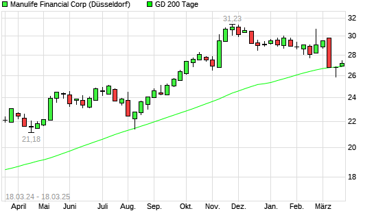 Mit dem Anstieg auf 27,14 EUR hat die Manulife Financial-Aktie am 17.03.2025 die 200-Tage-Linie nach oben gekreuzt.