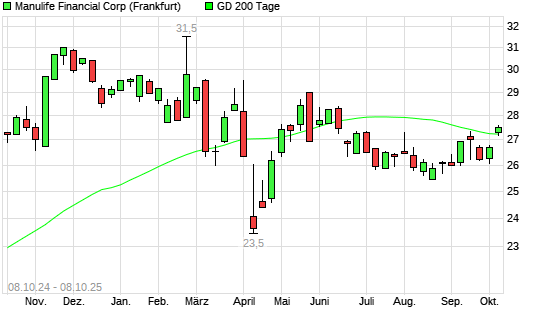 Mit dem Anstieg auf 27,58 EUR hat die Manulife Financial-Aktie am 07.10.2025 die 200-Tage-Linie nach oben gekreuzt.