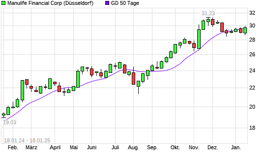 Mit dem Anstieg auf 29,73 EUR hat die Manulife Financial-Aktie am 17.01.2025 die 50-Tage-Linie nach oben gekreuzt.