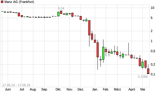 Mit dem Rücksetzer auf 0,11 EUR hat die Manz-Aktie (ISIN DE000A0JQ5U3) am 16.05.2025 ein neues All-Time-Low erreicht und damit den Kurs vom 15.05.2025 eingestellt.