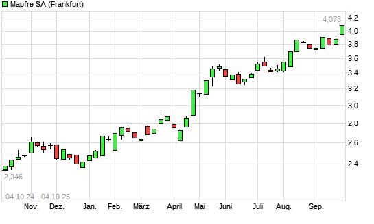 Mit dem Anstieg auf 4,08 EUR hat die Mapfre-Aktie (ISIN ES0124244E34) am 03.10.2025 ein neues 10-Jahres-Hoch erreicht und damit den Kurs vom 30.09.2025 eingestellt.
