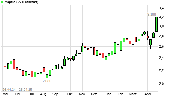 Mit dem Anstieg auf 3,19 EUR hat die Mapfre-Aktie (ISIN ES0124244E34) am 25.04.2025 ein neues 5-Jahres-Hoch erreicht und damit den Kurs vom 18.03.2025 eingestellt.