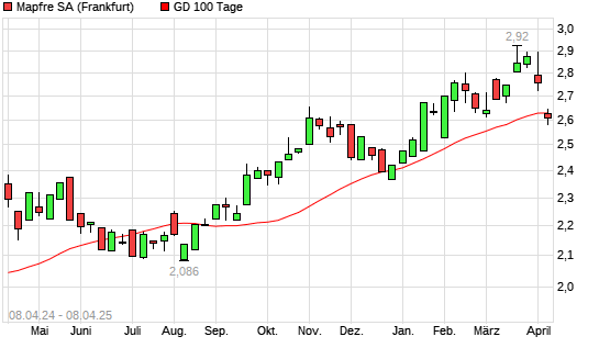 Mit dem Rücksetzer auf 2,61 EUR hat die Mapfre-Aktie am 07.04.2025 die 100-Tage-Linie nach unten gekreuzt.