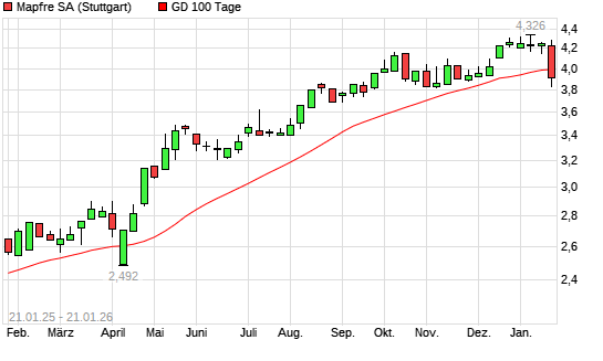 Mit dem Rücksetzer auf 3,94 EUR hat die Mapfre-Aktie am 20.01.2026 die 100-Tage-Linie nach unten gekreuzt.