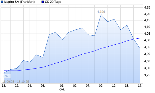 Mit dem Rücksetzer auf 3,94 EUR hat die Mapfre-Aktie am 17.10.2025 die 20-Tage-Linie nach unten gekreuzt.