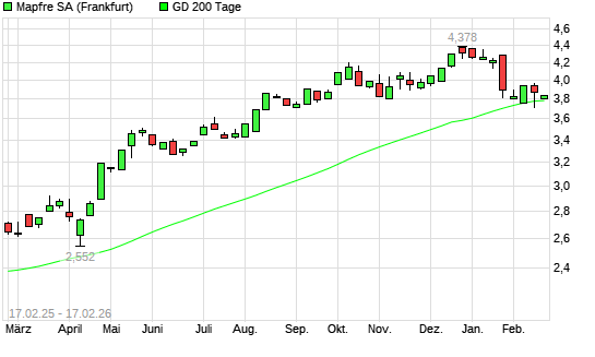 Mit dem Rücksetzer auf 3,80 EUR hat die Mapfre-Aktie am 16.02.2026 die 200-Tage-Linie nach unten gekreuzt.