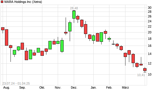 Mit dem Rücksetzer auf 10,67 EUR hat die Marathon Digital-Aktie (ISIN US5657881067) am 31.03.2025 ein neues 12-Monats-Tief erreicht und damit den Kurs vom 18.03.2025 eingestellt.