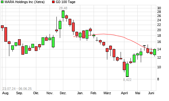 Mit dem Rücksetzer auf 12,93 EUR hat die Marathon Digital-Aktie am 05.06.2025 die 100-Tage-Linie nach unten gekreuzt.