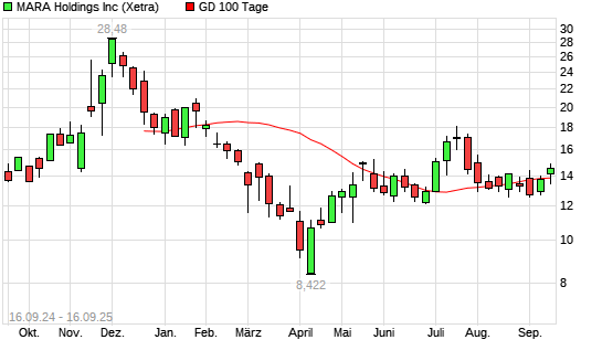 Mit dem Rücksetzer auf 13,71 EUR hat die Marathon Digital-Aktie am 15.09.2025 die 100-Tage-Linie nach unten gekreuzt.