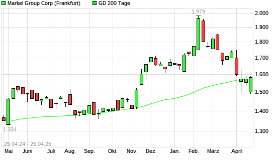 Mit dem Rücksetzer auf 1.568,00 EUR hat die Markel-Aktie am 24.04.2025 die 200-Tage-Linie nach unten gekreuzt.