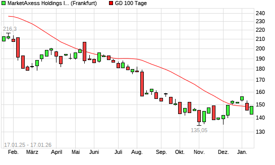 Mit dem Anstieg auf 148,80 EUR hat die MarketAxess-Aktie am 16.01.2026 die 100-Tage-Linie nach oben gekreuzt.