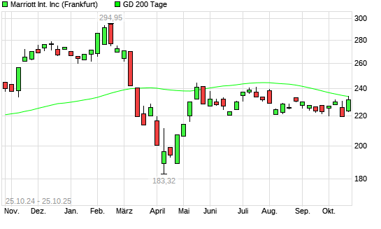 Mit dem Rücksetzer auf 231,65 EUR hat die Marriott International-Aktie am 24.10.2025 die 200-Tage-Linie nach unten gekreuzt.