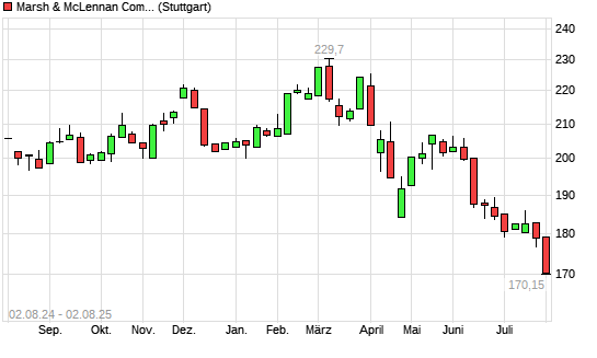 Mit dem Rücksetzer auf 172,70 EUR hat die Marsh & McLennan Companies-Aktie (ISIN US5717481023) am 01.08.2025 ein neues 12-Monats-Tief erreicht und damit den Kurs vom 31.07.2025 eingestellt.