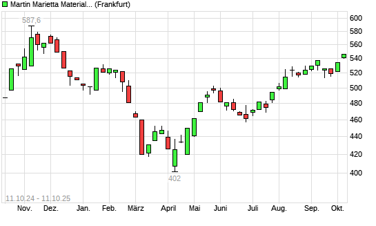 Mit dem Anstieg auf 546,60 EUR hat die Martin Marietta Materials-Aktie (ISIN US5732841060) am 10.10.2025 ein neues 6-Monats-Hoch erreicht und damit den Kurs vom 09.10.2025 eingestellt.
