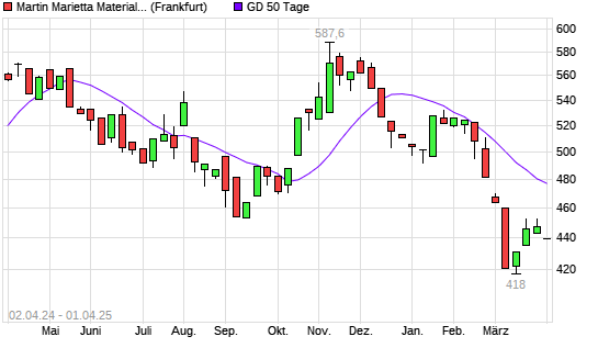 Mit dem Rücksetzer auf 439,50 EUR hat die Martin Marietta Materials-Aktie am 31.03.2025 die 50-Tage-Linie nach unten gekreuzt.