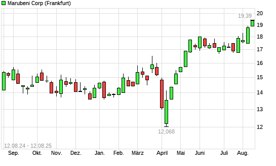 Mit dem Anstieg auf 18,89 EUR hat die Marubeni-Aktie (ISIN JP3877600001) am 11.08.2025 ein neues All-Time-High erreicht und damit den Kurs vom 08.08.2025 eingestellt.