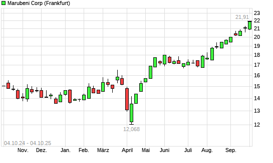 Mit dem Anstieg auf 21,90 EUR hat die Marubeni-Aktie (ISIN JP3877600001) am 03.10.2025 ein neues All-Time-High erreicht und damit den Kurs vom 02.10.2025 eingestellt.