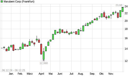 Mit dem Anstieg auf 23,68 EUR hat die Marubeni-Aktie (ISIN JP3877600001) am 05.12.2025 ein neues All-Time-High erreicht und damit den Kurs vom 04.12.2025 eingestellt.