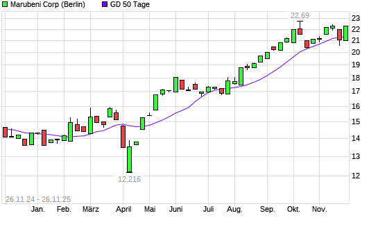 Mit dem Anstieg auf 21,78 EUR hat die Marubeni-Aktie am 25.11.2025 die 50-Tage-Linie nach oben gekreuzt.