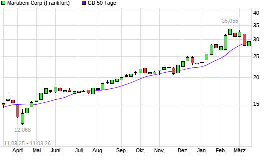 Mit dem Anstieg auf 29,96 EUR hat die Marubeni-Aktie am 10.03.2026 die 50-Tage-Linie nach oben gekreuzt.