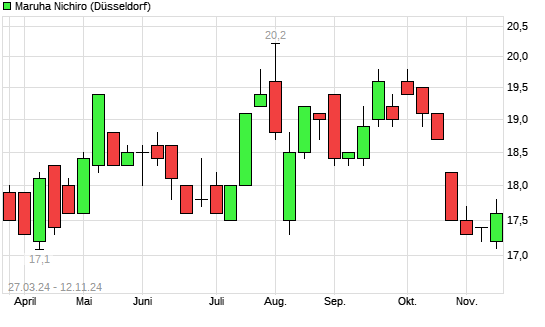 Mit dem Rücksetzer auf 17,10 EUR hat die Maruha Nichiro-Aktie (ISIN JP3876600002) am 11.11.2024 ein neues 6-Monats-Tief erreicht und damit den Kurs vom 05.11.2024 eingestellt.