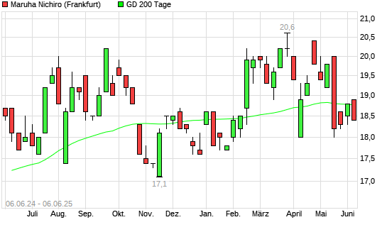 Mit dem Rücksetzer auf 18,40 EUR hat die Maruha Nichiro-Aktie am 05.06.2025 die 200-Tage-Linie nach unten gekreuzt.
