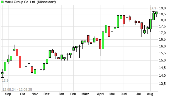 Mit dem Anstieg auf 18,70 EUR hat die Marui Group-Aktie (ISIN JP3870400003) am 11.08.2025 ein neues 5-Jahres-Hoch erreicht und damit den Kurs vom 08.08.2025 eingestellt.